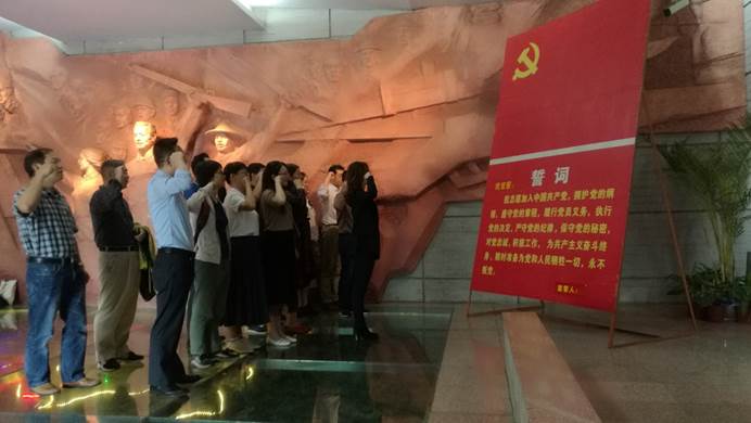 在参观结束后,全体教师党员面对党旗,高举右拳,字字铿锵,重温入党誓词,彰显了学院全体教师党员不忘初心、牢记使命的坚定政治信念,让全体党员回想入党之初对党和人民的庄严承诺,牢记为人民服务的使命。